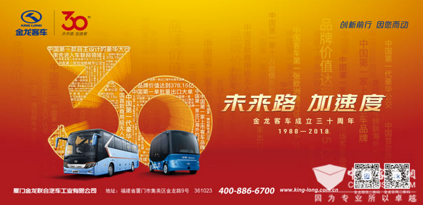 30年前,金龙客车因“自主品牌造车梦”而起航,30年后,又因“中国汽车强国梦”提速前行。血液里融合着“工匠精神”的一代又一代金龙人,身怀匠心,秉持初心,凭借精良的品质、领先的技术、创新的精神,努力为客户提供更优质的产品,为大众提供更舒适的出行体验。