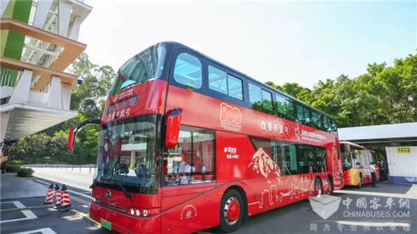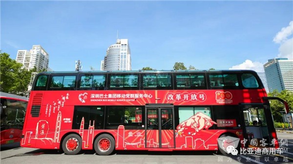 在庆祝建党100周年之际,深圳巴士集团选择比亚迪纯电动公交车为载体,推出3条红色主题线路、打造“改革开放号”和“东江纵队号”2个移动党群服务中心,将2+50台车辆进行红色主题涂装,选取庆祝建党百年的宣传标语、象征开拓进取深圳精神的“拓荒牛”等元素,构建红色文化宣传氛围,让市民在绿色出行的同时,领略深圳的红色精神。