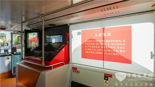 本次比亚迪纯电动双层观光巴士的“全妆焕新”,旨在打造沉浸式党史教育移动阵地。其中,“改革开放号”充分利用车内休闲吧台、全息沉浸式投影技术、5G+VR等设备,围绕“红色文化”宣传,专设读书角、拍照打卡等功能区,配置车票打印、空气成像、全息投影、光明网联播屏等设施;车窗应用超透材料做成了改革开放史、中国共产党历次全国代表大会、东江纵队革命历程等主题的宣传展板,在学习党史知识的同时,也可欣赏深圳城市美景。