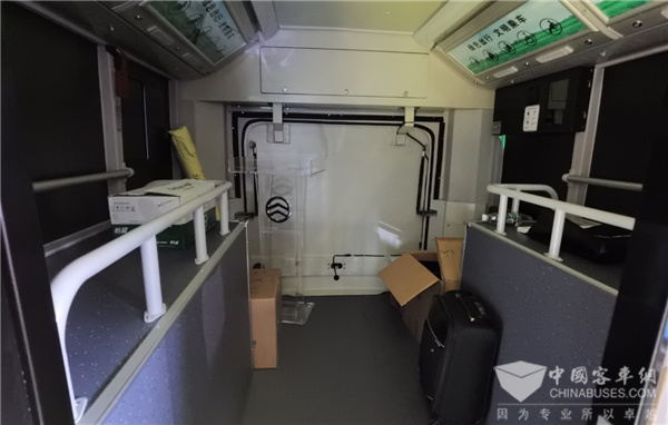 车厢中部设有11个乘客座,前部副驾驶1个正向乘客座,整体为典型的城乡公交车双排座椅布局形式。二级踏步,安装32寸LCD导乘屏、上下客门迎宾灯、USB充电口等设施,并预留有上下车刷卡线缆。