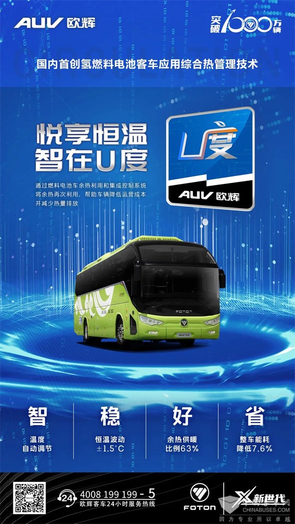 福田欧辉的氢能源技术不仅实现“零碳排放”,其衍生的国内首个氢燃料电池客车应用综合热管理技术——U度更是将氢燃料电池所产生的废热进行循环利用,并在燃料电池功率达到75%时即可实现全余热供暖,让整车能耗降低7.6%,也大幅降低车辆热能的排放。