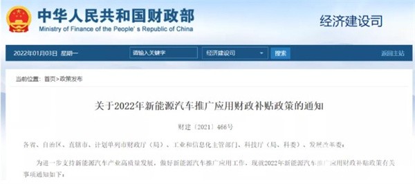 在2021年的最后一天,财政部、工业和信息化部、科技部、国家发展改革委四部门联合发布《关于2022年新能源汽车推广应用财政补贴政策的通知》(下称“《通知》”)以及《2022年新能源汽车推广补贴方案》(下称《方案》)。