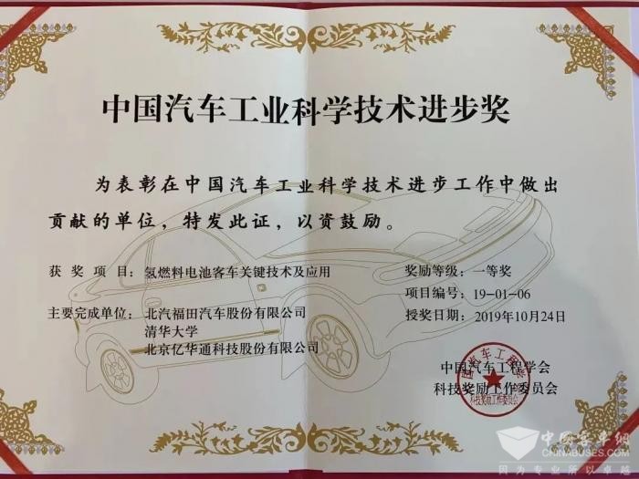 福田欧辉氢燃料电池客车技术荣获中国汽车工业科技进步奖一等奖