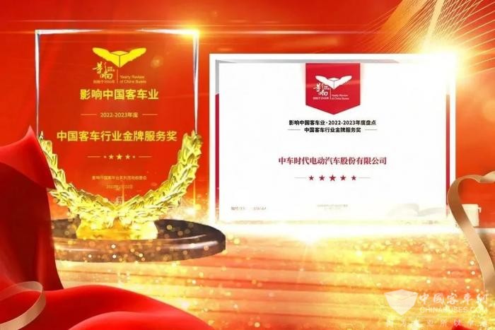 2023年2月22日,第17届影响客车业年度盘点颁奖典礼在南京隆重开幕。经过网络投票和专家评委评审,中车电动摘得2022-2023年度“中国客车行业金牌服务奖”,中车电动C10荣获“新能源客车推荐车型”。
