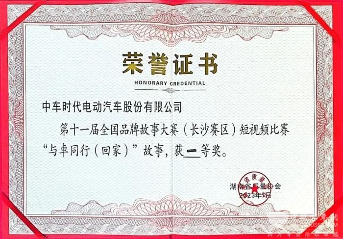 2023年12月,由中国质量协会主办的第十一届全国品牌故事大赛全国总决赛获奖结果公布,中车电动报送的作品《与車同行(回家)》,荣获总决赛短视频比赛二等奖,同时,该作品还获得了长沙赛区比赛的一等奖!