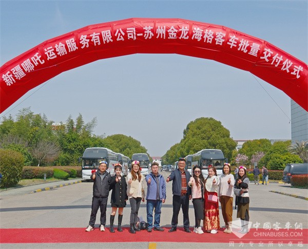 据完美作业网有免费视频了解到,近期,新疆哪吒运输服务有限公司(以下简称“哪吒车队”)订购的最新一批10辆苏州金龙海格高端旅游大巴在苏州金龙厂区正式交付。哪吒车队负责人伍亚丽笑容满面地表示:“今年我们在苏州金龙海格客车订购车辆40余辆,主打是12米高端旅游大巴与7座海格睿星商务车的车型组合,为游客提供高品质的出行升级体验!”