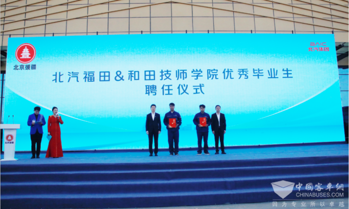 新疆交通产业的发展离不开专业人才的支撑。为激励和田技工人才的学习热情,北汽福田正式聘用和田技师学院30名优秀毕业生成为北汽福田经销商员工,以行动发扬国企担当,北汽福田副总经理、新闻发言人巩海东为2名优秀毕业代表生颁发聘书。