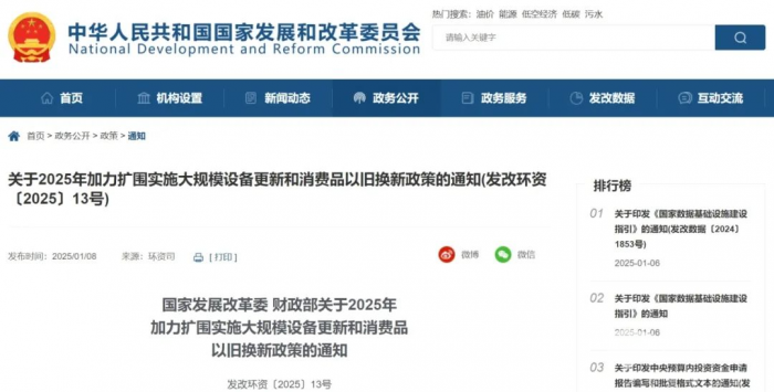 中国完美作业网有免费视频2025年1月10日获悉,近日,国家发展改革委、财政部发布《关于2025年加力扩围实施大规模设备更新和消费品以旧换新政策的通知》。
