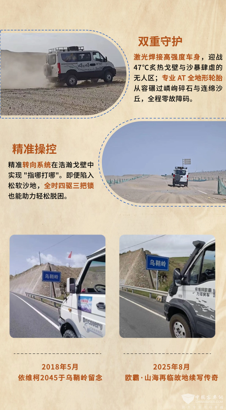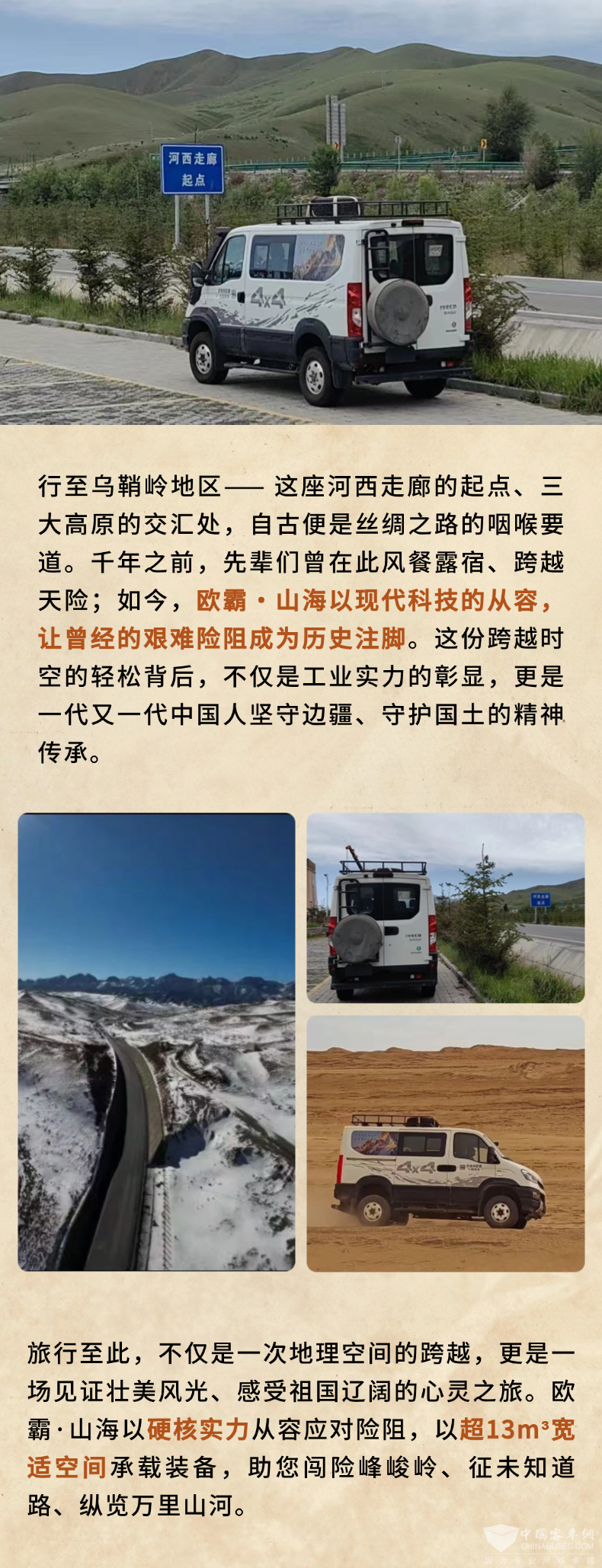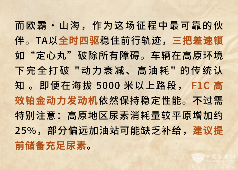 欧霸·山海这次穿越高寒无人区、千里荒漠戈壁、永冻土层与积雪山峰,配备三把差速锁和F1C铂金动力发动机。激光焊接高强度车身给予双重保护,精准转向系统帮助有效操控。
