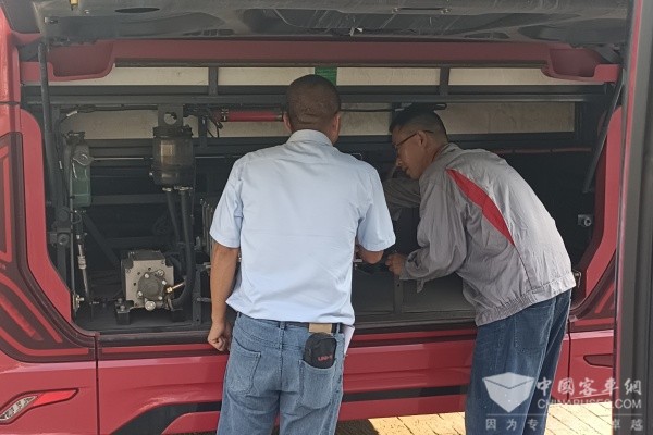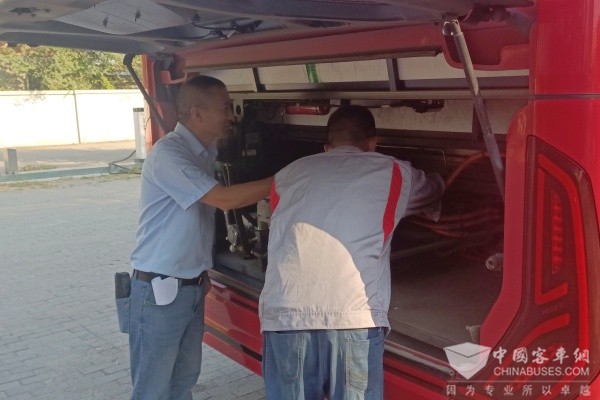 苏州金龙海格客车驻外服务工程师张为城介绍:“从8月初开始,我们就对67辆上会车辆进行全面检查,针对车辆的制动、转向、轮胎等关键部件,仔细排查是否有磨损和松动情况;同时还检查了车内座椅、空调、照明等设施,确保参会人员乘坐舒适,并逐一检测了纯电动客车的电池、电机、电控系统,确保续航和运行稳定。”会议期间,服务保障团队更是开启“24小时全天候服务”模式,确保车辆始终以最佳状态投入服务。