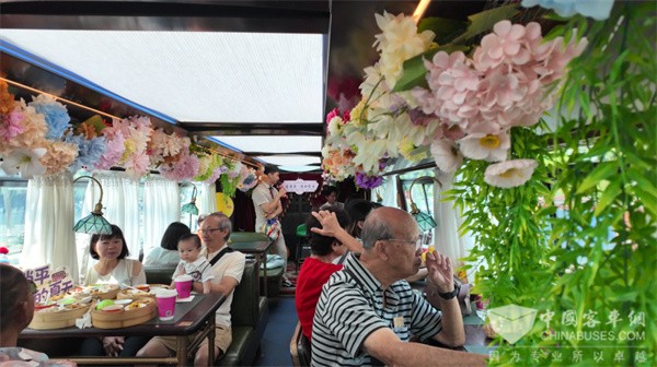 二是舒适化空间改造,车辆摒弃了传统公交车的密集座椅,车内换成了相邻吧台与沙发座椅——独自出行的游客可坐在吧台旁,一边喝茶一边与邻座闲聊;亲子家庭则能窝在沙发里,轻松享受亲子时光。