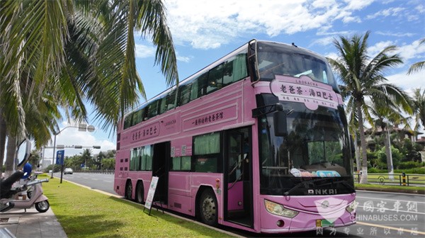 走近安凯双层观光巴士,第一眼便会被它的外观吸引——车身以海南省花三角梅为设计元素,粉紫相间的色彩鲜活灵动,随手一拍都是“朋友圈大片”。而踏入车内,木质饰板、复古吊灯与藤编细节营造出温润的南洋风情,恰好呼应海口骑楼老街的历史韵味,仿佛一秒穿越到南洋老街区。