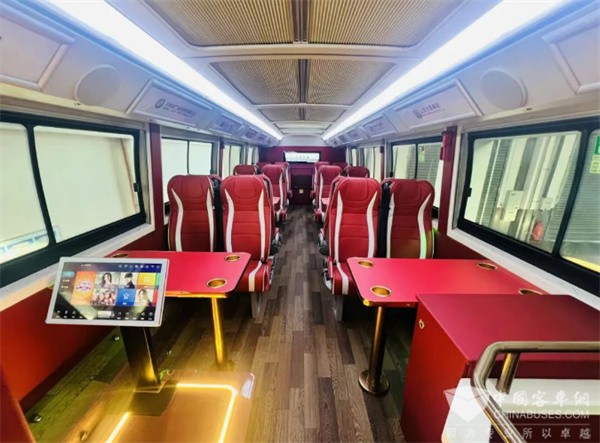 在内部空间设计上,E12S同样匠心独运,精准回应乘客多元需求。一层空间特设公交主题文创展柜,荟萃承载太原城市记忆的特色文创,让地域文化在方寸之间绽放独特魅力;二层采用卡座式散座布局,搭配高档真皮座椅,营造出惬意舒适观景氛围。