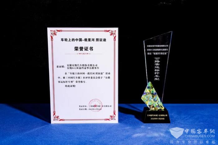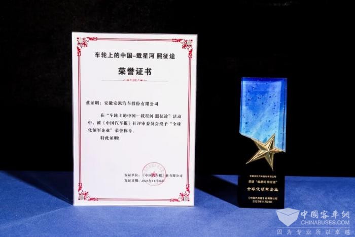 2025年11月26日,由《中国汽车报》社有限公司主办的2025商用车产业合作发展大会在北京召开。在备受瞩目的 “车轮上的中国” 年度盛典环节中,安凯客车以卓越的综合实力荣膺“全球化领军企业”称号。同时,旗下明星产品安凯N12双前挡豪华公路客车凭借出色表现斩获“公路客车标杆车型”荣誉称号。双誉并收,彰显了安凯客车在产品创新与全球战略上的双重突破。