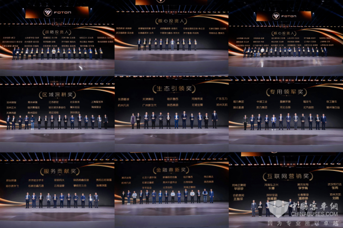 为凝聚合作伙伴共创未来的信心与决心,福田汽车常务副总经理鹿政华主持了核心投资人和战略投资人授牌仪式,现场为45位长期与公司同频共振的战略及核心投资人授牌,他们将获得"专属政策支持、专业人才培养、战略协同共创"等全方位赋能。同时,大会还对全年表现优异的经销商分别授予"区域深耕奖"、"生态引领奖"、“专用领军奖”、"服务贡献奖"、“金融领航奖”、“互联网营销奖”荣誉。
