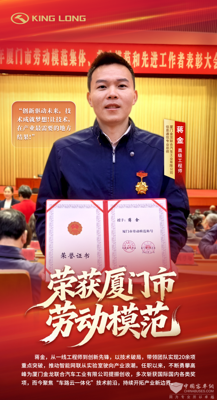 2025年12月18日,厦门市劳动模范集体、劳动模范和先进工作者表彰大会举行,一批在全市经济社会发展各条战线上作出突出贡献的先进典型受到表彰。其中,厦门金龙联合汽车工业有限公司信息通信专业总师蒋金获评厦门市劳动模范,成为制造业科技创新一线劳动者的代表之一。