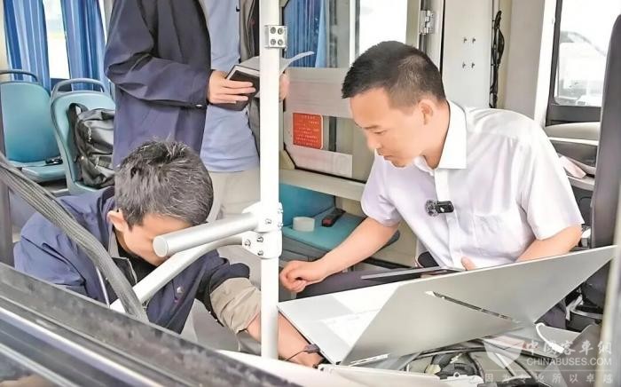 (蒋金和团队成员在为一辆智能网联公交车进行相关零部件的功能检测)