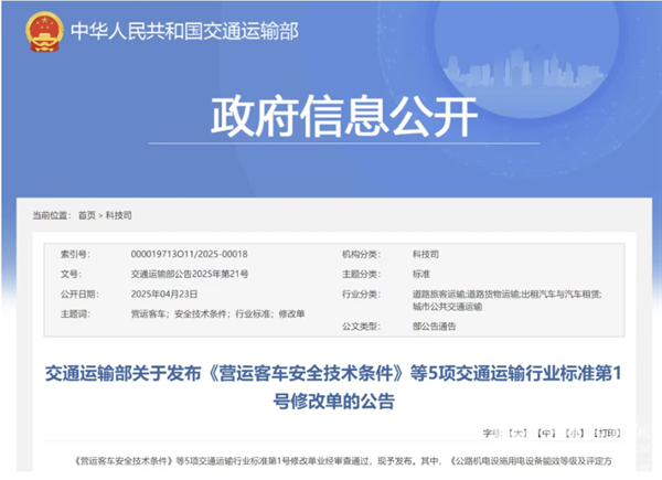 2025年4月23日,《交通运输部关于发布<营运客车安全技术条件>等5项交通运输行业标准第1号修改单的公告》正式发布。其中,《营运客车安全技术条件》行业标准修改内容主要聚焦在:增加营运车辆自动紧急制动系统(AEBS)及车道偏离预警系统(LDWS)等内容,以进一步升级车辆安全技术要求。标准修改内容自发布之日起9个月后实施。