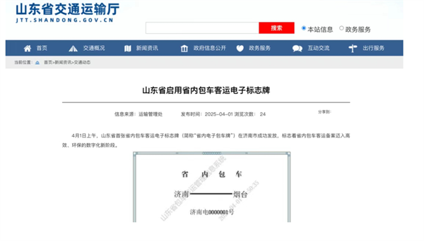 2025年 4月1日,山东省首张省内包车客运电子标志牌(简称“省内电子包车牌”)在济南市成功发放。省内包车客运电子标志牌法律效力等同于纸质标志牌,包车备案业务原有填报渠道和备案申请方式不变,审核通过后自动生成电子包车牌,无需线下领取,实现全流程“一网通办”。