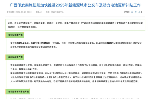 2025年4月下旬,广西壮族自治区交通运输厅、发展改革委、财政厅、公安厅、商务厅联合印发《广西壮族自治区2025年新能源城市公交车及动力电池更新补贴实施细则》,支持车龄8年及以上,即2017年12月31日前(含当日,下同)注册登记的城市公交车更新,以及2025年12月31日前超出质保期或不满足安全运营条件的新能源城市公交车全套动力电池更换;更新新能源城市公交车,每辆车补贴10万元,并对更新为低地板及低入口车型予以适当倾斜,在上述补贴标准的基础上增加2万元。更换动力电池,每辆车补贴4.2万元。