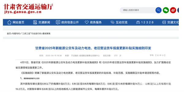 2025年4月11日,甘肃省印发《2025年新能源公交车及动力电池更新补贴实施细则》和《2025年老旧营运货车报废更新补贴实施细则》,明确了新能源公交车及动力电池更新、老旧营运货车报废更新的补贴标准、补贴范围、实施期限及补贴申请流程等内容。更新新能源城市公交车的,新购车辆长度在6米以下的每辆补贴6万元,6米(含)至8米的每辆补贴8万元,8米(含)至10米的每辆补贴14万元,10米(含)以上的每辆补贴19.2万元,对新购车辆车长8米(含)以上的低地板低入口新能源城市公交车,每辆车额外补贴3万元。更换新能源城市公交车动力电池的,每辆车补贴4.2万元。