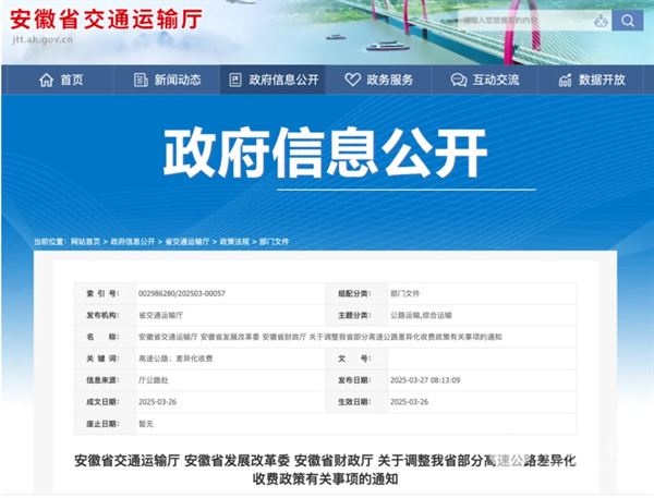 2025年3月下旬,安徽省交通运输厅、安徽省发展改革委、安徽省财政厅印发《关于调整我省部分高速公路差异化收费政策有关事项的通知》,选取省内可调整优化的大部分高速公路路段,对营运客车和货车,按照分路段差异化收费原则,实行通行费八五折优惠;除此之外省内高速公路,实行通行费九五折优惠。调整后的差异化政策自2025年4月1日起施行。