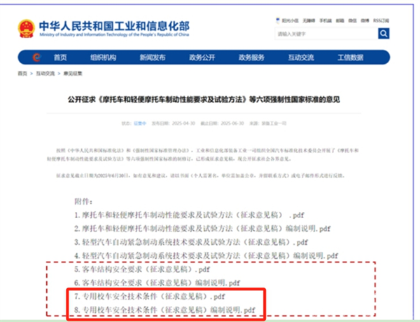 2025年4月30日,工信部公开征求《客车结构安全要求》、《专用校车安全技术条件》等六项强制性国家标准的意见。