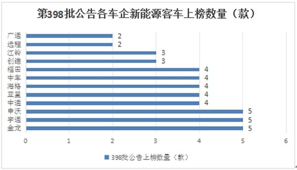 在第398批公告中有17个客车品牌企业参与了新能源客车新品申报,各个品牌上榜数量统计如下:上榜数量在2款及以上的车企品牌统计如下: