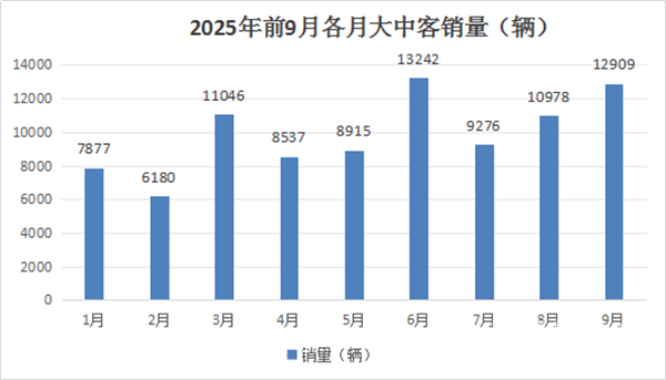 根据中国客车统计信息网数据,2025年1-9月各月我国大中型客车销量统计: