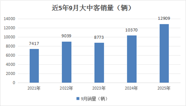 上图可见,2025年9月6米以上客车销量12909辆,创近5年同期最高,可见今年9月的大中客市场最好的年份。