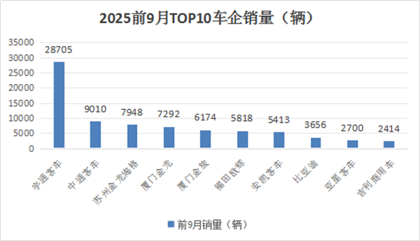 表2,根据中国客车统计信息网数据,2025年1-9月6米以上客车top10累计销量排行: