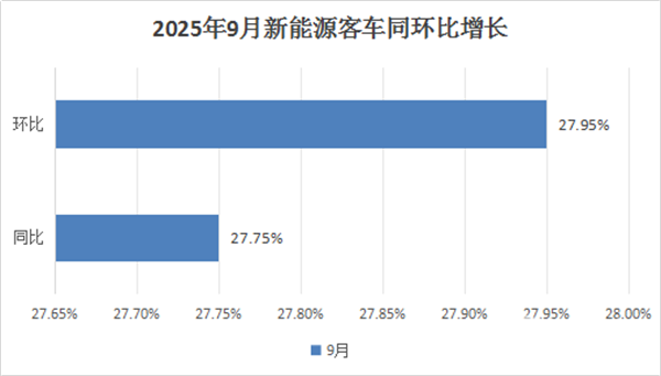 根据中国客车统计信息网数据,2025年9月我国6米以上新能源客车销量6274辆,同比增长27.75%,环比增长27.95%。可见今年9月我国大中型新能源客车市场呈现了同环比“双增”、且增速均接近3成。