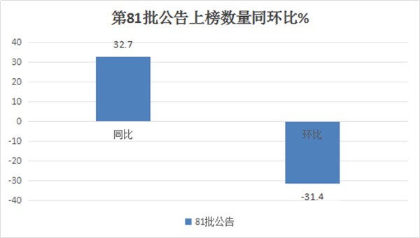 第81批达标车型公告上榜数量环比呈现较大幅度下降,主要是上月公告的上榜数量是今年以来最高的月份,给本批次公告上榜数量环比增长带来较大压力。