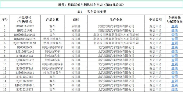 上图可见,在交通部第81批上榜的达标的道路运输客车车型公告中:
