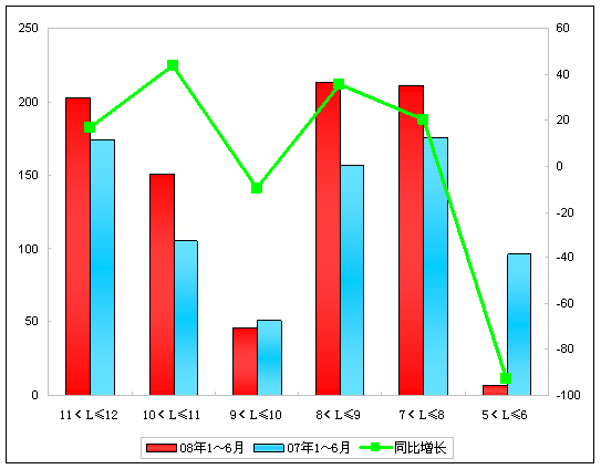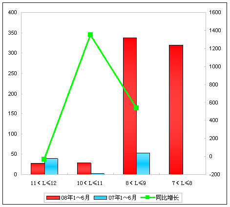由上表可以看出:08年1~6月销售比去年同期增长24.26%,除3.5~5米以外,,全线增长。增长最快的是大于12米的特大型客车,增幅达到804%,其次是11~12米,增长达到40.82%,下降最多的是3.5~5米,达到-19.9%。