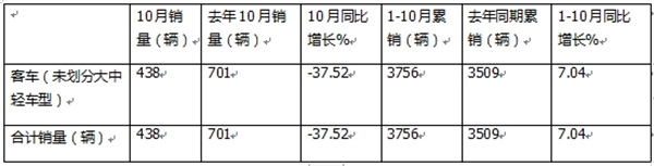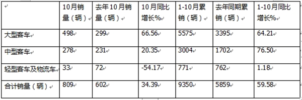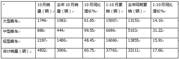 二、 金龙汽车:10月销量同比增长60.75%,1-10月累销同比增长17.6%