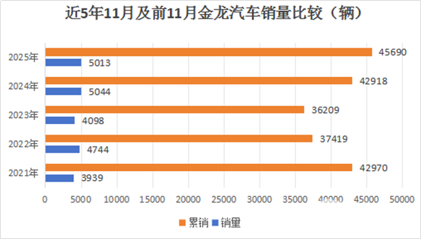 上图可见,2025年11月及1-11月金龙汽车销量分别为5013辆和45690辆,分别创下近5年同期第二和第一。