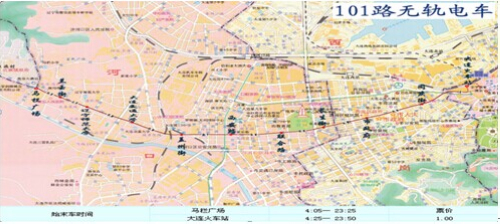 据了解,101路无轨电车线路地面全部为公用线路,大连火车站为枢纽站形式,西安路为主要换乘站。通信信号系统采用集团公司智能调度系统,实现车辆与地面的通信联络;由城市交通信号系统根据道口的交通流量,给予无轨电车优先通行权;全线设牵引变电所3座,采用直流600伏供电,接触网高度5.3米。全线采用接触网立杆与城市路灯同杆架设。