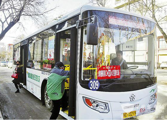 2016年12月27日,在城区胜利大街小寨小学公交站牌,市民走向309路电动公交车准备乘车。从2016年12月26日起,渭南城区新增的26辆电动公交车上路运营。