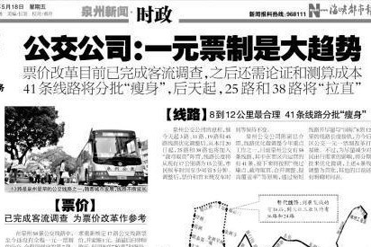 2012年5月18日A14《公交公司:一元票制是大趋势》:海都报做的700份公交服务问卷调查中,有近7成的市民认为公交票价偏贵。泉州公交公司回应称“市区公交一元一票制是大趋势”,已完成客流调查,此后将听取市民意见并组织专家论证,最后物价部门还将对此进行成本测算。