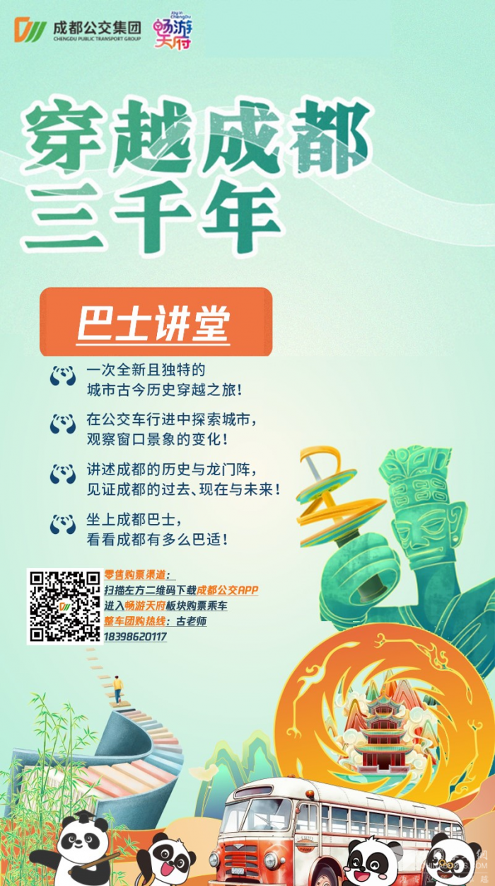 坐上“巴士讲堂”公交专线,由成都原点出发,从北向南,沿着全球最长的城市中轴线,依次探索摩诃池、东华门遗址、天府广场、华西坝、天府立交、环球中心、成都规划馆,在公交“窗口”景象的变化中,观察这座城市的过去、现在与未来。