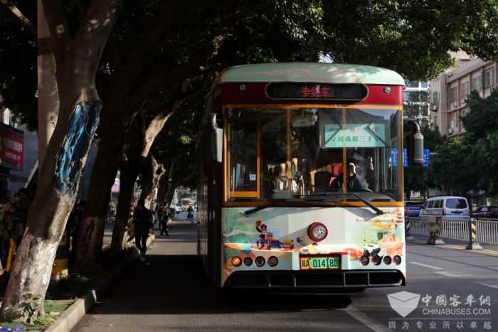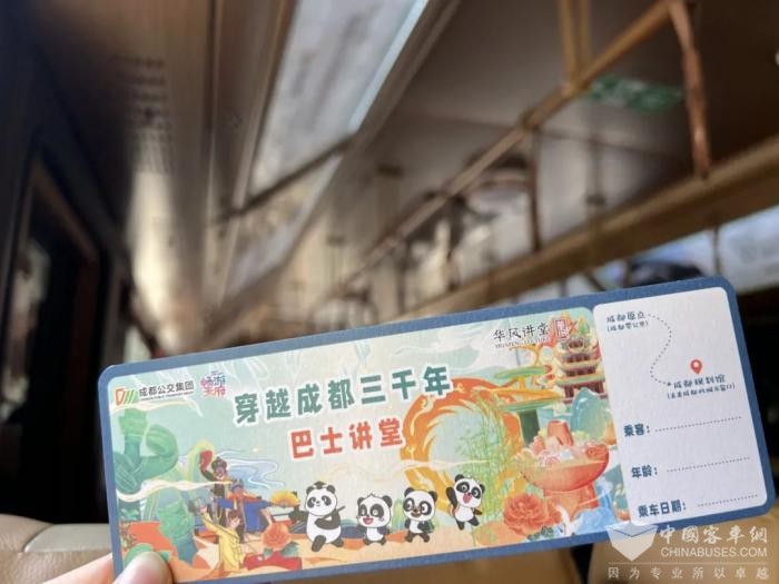 巴士讲堂以新能源大巴为载体,车身将太阳神鸟、熊猫、芙蓉花等成都市代表性元素浓缩于有限的可移动空间,车内设置多媒体课堂,课程涵盖成都三千年来的历史变迁,以及蓉城文化、民俗风情和成都公交发展历史的展示,让乘客们在边走边听边聊的沉浸式氛围中激发参与热情,用全新的视角去认识和了解这座城市。