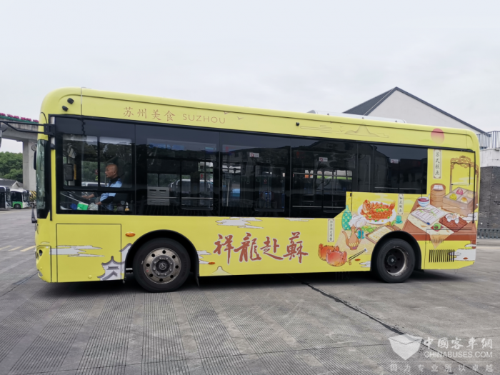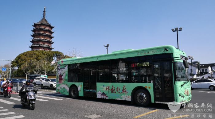 在主题车身的打造上,苏州公交集团于今年农历二月初二“龙抬头”之际,在游1线路上亮相的“祥龙赴苏”园林主题公交车,成为了城市中一道独特的风景线。这辆公交车首次采用手绘图案,以绿色为主色调,象征春意盎然。车身上蜿蜒的祥龙与点缀其间的狮子林、北寺塔等园林元素,与游1线途经景点巧妙融合,生动展现了苏州古典园林的独特韵味。