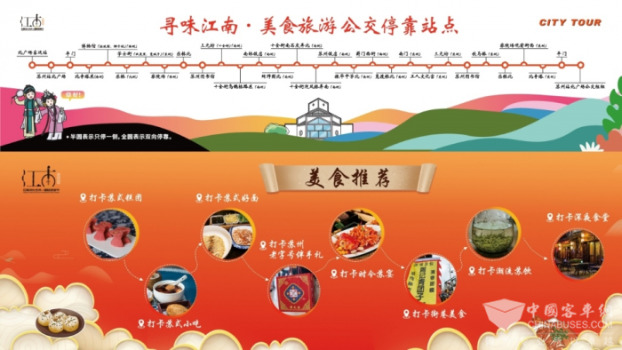 除了主题车身的打造,苏州公交集团还在促进城市活动参与度、车厢文化与公交线路特色融合方面迈出了创新步伐。结合今年苏州举办的第六届江南文化艺术·国际旅游节“乐游江南·寻味苏州”这一大型城市活动,公交集团姑苏公司精心策划并推出了“苏味美食专线”。这条线路巧妙串联起拙政园、苏州博物馆、狮子林、平江路、十全街、网师园等苏州古城区的众多热门景点,同时覆盖多家具有苏式特色的美食店铺。