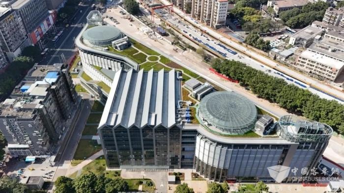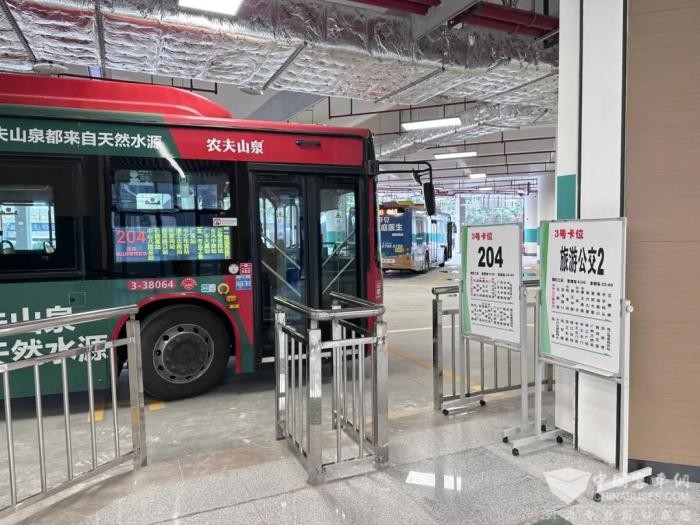第二、三层为公交停放区及充电区域,站场采用“南进北出”疏导模式,公交车辆沿中山八路进入枢纽大楼西广场落客后,再有序停放于此。