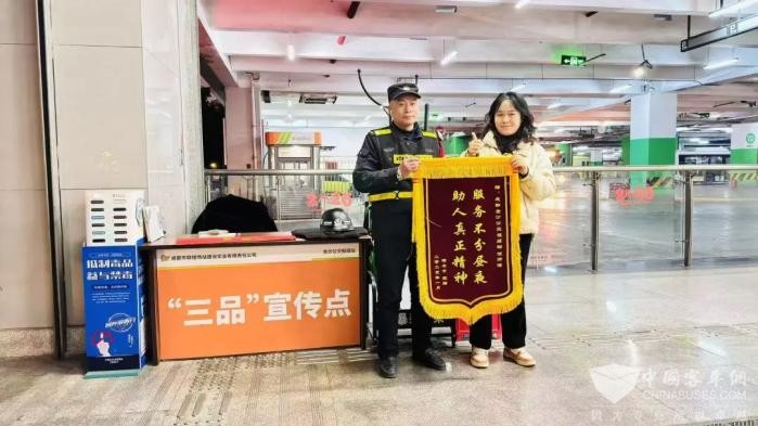 1月16日下午18时,陶女士来到成都公交金沙枢纽站,送上“服务不分昼夜,助人真正精神”锦旗,向认真负责、热心帮助她的公交人但师傅表示赞许与感谢!