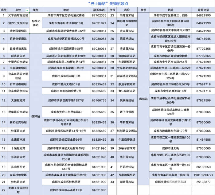(二)联系附近巴士驿站的工作人员寻求帮助。目前,成都公交已在全市范围内建成投用3个标准化巴士驿站和40个微驿站,形成“3+N”失物招领服务网格,为市民乘客提供贴心失物招领服务。