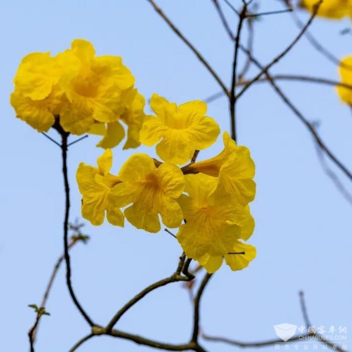 黄花风铃木每到花期,都是满树金黄,不见一片绿叶。那一朵朵喇叭状的花朵,簇拥在一起,在阳光的照耀下,闪烁着金色的光芒,仿佛整个世界都被这灿烂的金黄所点亮。