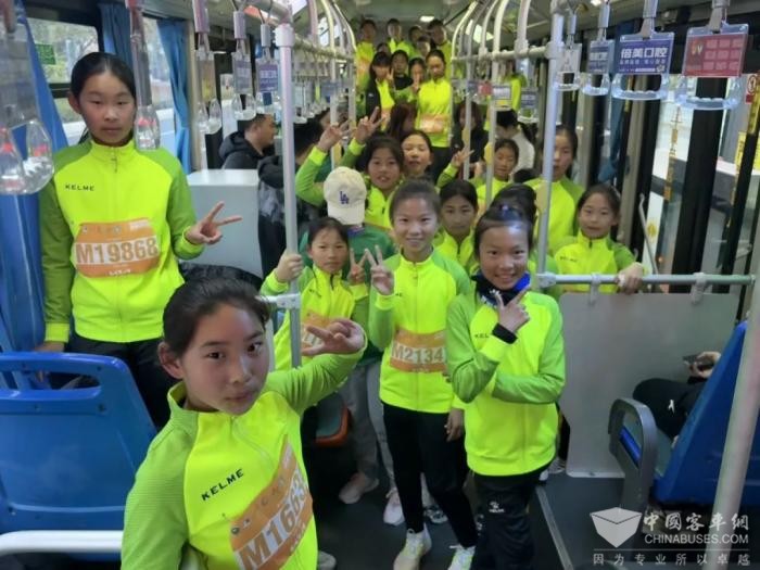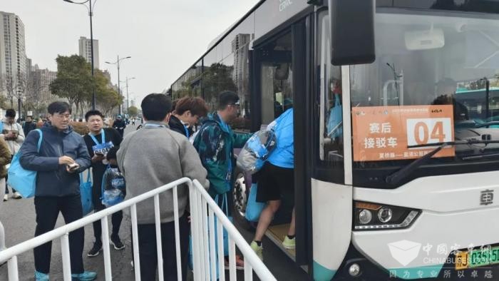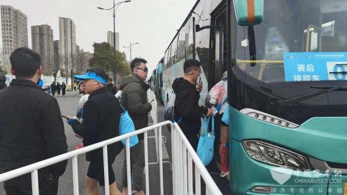 赛事当天,为了做好运动员接驳工作,市公交公司共开通了6条赛前接驳专线,安排222辆公交车从市区各个方向免费运送参赛选手,接送志愿者、医疗队等。