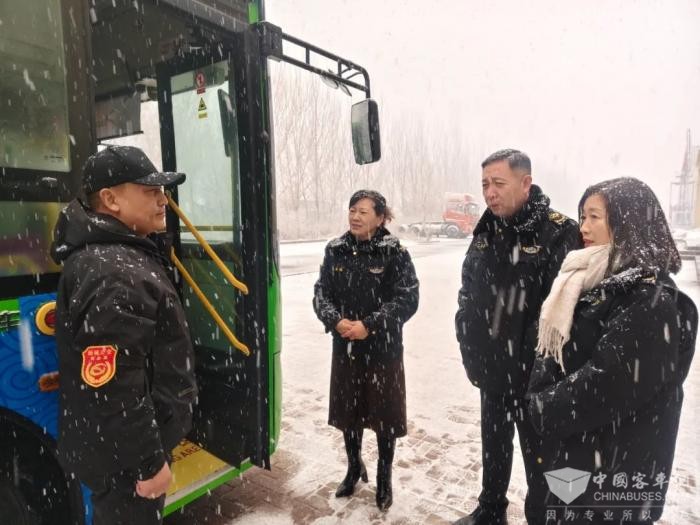 “走,咱们跟25路走一圈。”特殊天气,九车队队长张帆和安全队长王刚进行跟车,叮嘱驾驶员针对雪天路况复杂,注意慢行车、缓刹车,保持车距。
